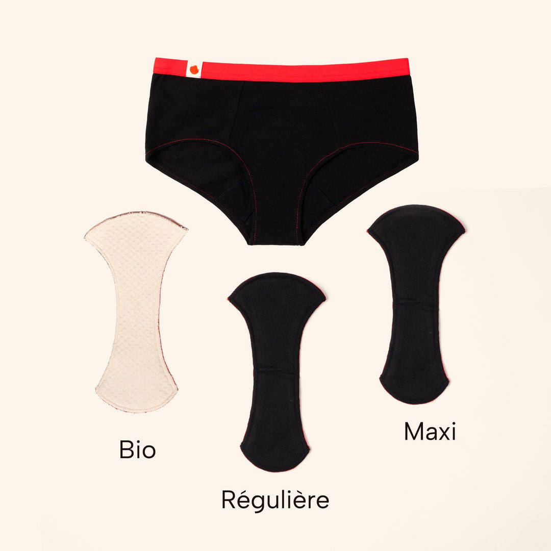 Quel que soit le modèle, toutes nos culottes (modèles de jour) sont faites à base de coton et contiennent des serviettes sanitaires amovibles faites d’un tissu absorbant.
